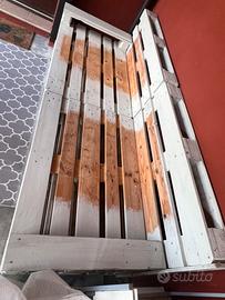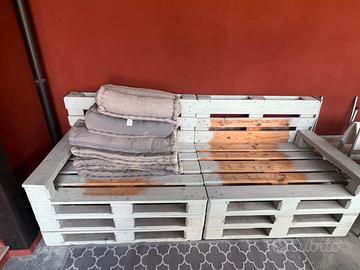 Vendo panca fatta con bancali Epal verniciata estremamente. Tutta smontabile. Disponibili 2 cuscini per la seduta e 2 cuscini medi per lo schienale. Vendo in blocco a 120 euro. Preferibile ritiro a mano.