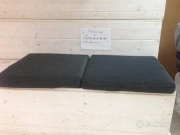 panche per qualsiasi evento per giardino , per locali, per ville grandi , e' per tutti tipi di locali stanno bene da per tutto m.240 × 60 × 42prezzo 150l' unosono 6 panche completo di cuscini neri ogni panca ne porta 3 cuscini