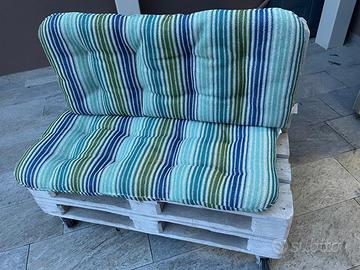 Panca artigianale di pallet con ruote girevole come da foto e cuscini rivestiti.