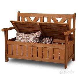 La panca ospita due persone, il baule si apre dall'alto e può contenere qualunque oggetto tipo gli attrezzi per il giardinaggio, i giocattoli dei bambini, cuscini, gli articoli di arredamento esterno che non si usano nella stagione invernale tipo il gazebo pieghevole o l'ombrellone.