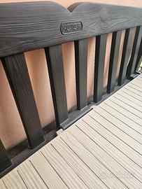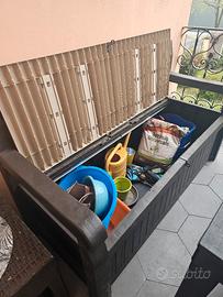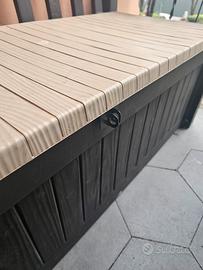 CAPIENTE E FUNZIONALE: design elegante con un ampia capienza di 265lt; adatta per riporre oggetti per la casa, giardino e piscina. Mantiene il contenuto asciutto e ventilato. Si adatta perfettamente ad ogni giardino, terrazzo o veranda. RESISTENTE E CONFORTEVOLE, Seduta adatta per due persone. Dimensioni della seduta 124x47,5 cm Altezza della seduta 45cm. Struttura interna rinforzata con alluminio SICURA: la cassapanca da esterno Eden Bench è sicura in quanto il coperchio può essere chiuso con un lucchetto. MONTATA MISURA: Lunghezza 140 x Profondità 64 x Altezza 84 cm Tenuta sul balcone per un paio d'anni, solo un piccolo difetto (v. foto) riscontrato durante il primo montaggio.