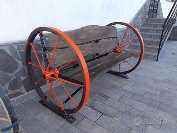 Panchina costruita con ruote da carro e tavole in legno di castagno in condizioni perfette. Per info 3339836850