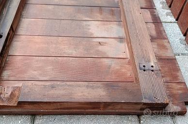 Pannelli decorativi in legno di varie dimensioni provenienti da finitura esterna sotto tettoia di una casetta anni ‘60. Complessivamente 6 pannelli con telaio in spesso legno di pino, con robusta struttura e aspetto perlinato. Dimensioni (cm): 44 x 183 / 46 x 103,5 / 46 x 90 / 44 x 77 / 44 x 77,5 / angolo: 22 x 61 x 61. Prezzi da 20 a 40 Euro al pezzo, a seconda delle dimensioni. I 6 pezzi in blocco 130 Euro.