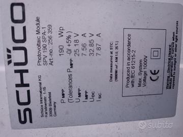 vendo pannelli fotovoltaici usati per 10-15 anni, risultanti da pratica di revamping, due tipologie, Schuco da 190 w e schott solar da 230 watt più recenti. solo ritiro in sede, no spedizione