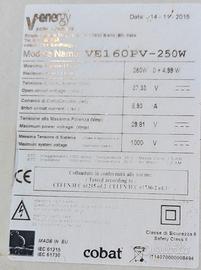 Offriamo pannelli fotovoltaici usati del modello VE160PV-250W, marca Venergy, in eccellenti condizioni operative. Recuperati da impianti funzionanti e testati per garantire prestazioni affidabili, questi pannelli monocristallini da 250W offrono un'elevata efficienza energetica con specifiche certificate (Voc: 37,33 V; Isc: 8,93 A; Vmp: 29,81 V).