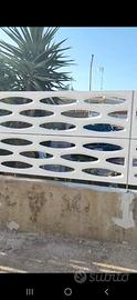 Pannelli resistenti rinforzati in vetroresina e metallo si possono utilizzare come ringhere, costruzione di cancelli, pareti divisorie, come angolo bar, per giardini e piscine zone solarium, oppure doccie e zona gioco, recinzioni. pannello grande misure:lunghezza mt 197 larghezza 55 cm spessore bordino laterale 4 cm. Pannello medio misura: lunghezza mt 185 larghezza 55 cm spessore bordino laterale 4 cm. pannello piccolo misura:lunghezza 182 larghezza cm 55 bordino laterale cm 4 . I pannelli si possono accorciare con il flex e modificare e pure forare, verniciare di qualsiasi colore e anche sovraporre per creazioni di pareti,montaggio in orizontale oppure in verticale, bullonare fra di loro.Oppure usando metallo a forma di H o a forma di U montaggio rapido ad incasso senza bulloni.