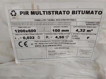 PIR Multistrato bitumato - dimensioni dei pannelli: 1200x600x 100 mm. Conduttività termica: 0,022 W/mK - Resistenza termica: 4,50 m2K/W - Reazione al fuoco: F - bordo dritto. Disponibili diversi metri quadrati, quantità su richiesta. Prezzo 25 €/mq