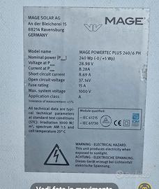 pannelli fotovoltaici policristallino mage 240w made in germany 164x98 mm smontati da campo fotovoltaico per revamping e perfettamente funzionanti, provati uno ad uno efficienza oltre il 90%. prodotto che verrà fatturato con la matricola, comprensivo di iva al 22% sconto su quantitativi superiori a 10 pezzi.