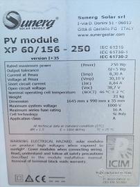 Vendo pannelli solari fotovoltaico SUNERG Solar 250W usati ma ancora in buone condizioni, ideali per seconda casa, tettoia ecc.. Misure: 1645x990x35 mm Non spedisco, solo consegna a mano. 6 pannelli minimo ad euro 150 (€ 25x6) 18 pannelli 360€ (20 € / pannello) 36 pannelli 612€ (17 € / pannello)
