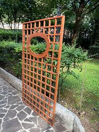 Vendo pannello grigliato rettangolare in legno di noce biondo da giardino o balcone per piante rampicanti o come semplice divisorio. Misure L 104 x H 192 x S 3 cm. Ritiro in loco. € 25.