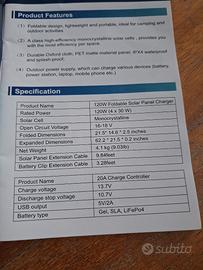 Pannello Solare ECO-WORTHY Pieghevole da 120 W con Regolatore di Carica da 20 A per la Ricarica di Batterie AGM/litio da 12 V. Comprato nel 2022. Ancora in buone condizioni. Comodo per campeggio, per frigo portatile in macchina, o altri usi.
