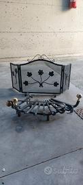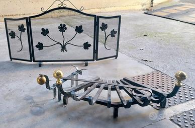 paracamino regolabile in larghezza (le due parti laterali si possono chiudere verso l'interno fino alla larghezza del camino) più poggialegna come da foto tutto in ferro battuto, regalo paiolo in rame come in foto
