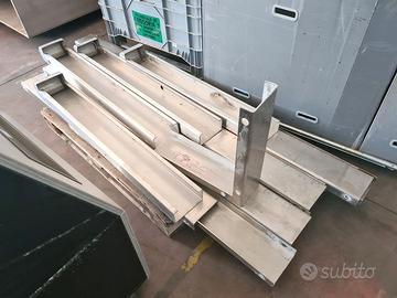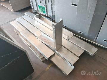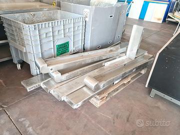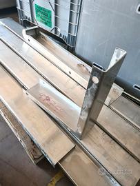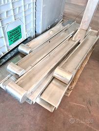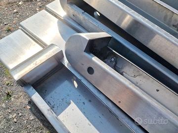 paracolpi in acciaio inox usati, si tratta di vari profili a C in acciaio inox sp. 3mm sez. 5X13cm con foro di fissaggio per tappi a pressione e foro più laro per avvitare il tappo con prolunga. mancano i tappi di chiusura del foro grande. disponibilità: - 4 pezzi di testata 130/120 X17cm sp.5/13cm - 60,00€ cad. iva esclusa - 1 pezzo di testata 100/90 X17cm sp.5/13cm - 45,00€ - 1 pezzo angolare 55X17cm h55cm - 55,00€ - 7 pezzi lineari 200X17cm sp.5cm - 90,00€ cad. - 1 pezzo lineare 100X17cm sp.5cm - 45,00€ - 1 pezzo lineare 60X17cm sp.5cm - 30,00€ se li acquisti tutti spendi 800,00€