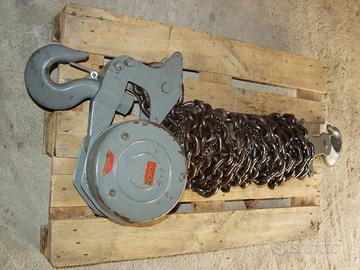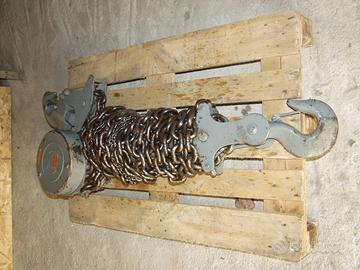 Paranco a catena con struttura robustissima, portata 5 T, con sei metri di catena di carico e sei metri di catena di manovra. Nuovo mai usato.