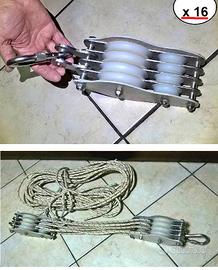 “Paranco a Violino” a 3 rinvii, costituito da due bozzelli, (uno doppio e uno singolo), predisposti per fune a mano fino a spessore massimo di 20 mm.