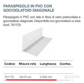 Vendesi, per mancato utilizzo, paraspigoli in PVC con gocciolatoio diagonale Fassa Bortolo. Dim. 10×10×250 cm. Disponibili n.16 pezzi Solo ritiro a mano