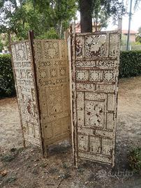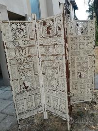 Paravento a 3 pannelli pieghevoli in legno intagliato.