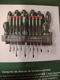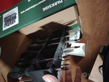 Set da 37 cacciaviti e punte con impugnature ergonomiche, punte magnetiche e supporto da parete per una conservazione ordinata; materiali in acciaio e plastica.