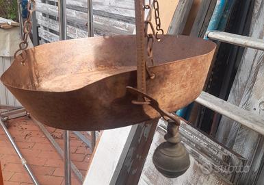 antica bilancia stadera, particolare il piatto che è profondo e con lati piegati per meglio svuotarlo. Utile se si pesava frumento o simili. Presenta segni di ruggine da usura perché avrà circa 100 anni.