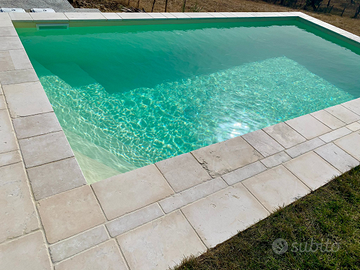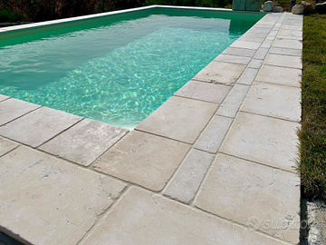 Pavimento in pietra di Trani burattato, spessore 3 cm e formato 15,20,25,30 cm a correre in varie lunghezze. Pavimento ideale per piscine e ambienti rustici. Prezzo a partire da 30 € al mq, iva e trasporto esclusi.