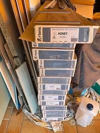 Pavimento laminato effetto legno marrone 1285 x 192 mm Sp. 8mm. Colore Artens H20 Honey. Resistente all'acqua, AC4 classe 32, adatto per stanze ad elevato calpestio. 13 pacchi sigillati nuovi e 1 aperto (27.5 metri quadri). Ogni confezione copre 1.973 metri quadri. Tappettino isolante in regalo (3 pezzi per circa 25 metri quadri totali) Costo in negozio 330€.