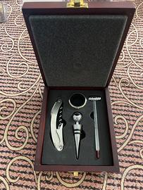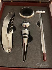 Premium set vino completo di 4 pezzi Con accessori in acciaio e argento Misure 17,5 x14,5x4,8 cm Peso 556 gr Box in legno trattato