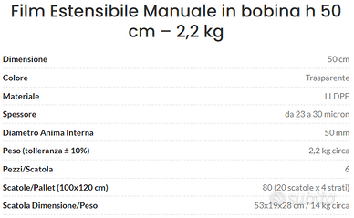 I Film Estensibili manuali, in LLDPE di prima scelta, sono disponibili in diversi formati e varianti di colore: bobina e miniroll, neri, bianchi e trasparenti. La resistenza alla lacerazione, l’alta conformabilità e l’elasticità li rendono ideali per avvolgere pallet e imballi di qualsiasi tipo, anche di forma irregolare o con sporgenze. Il loro utilizzo assicura l’integrità delle merci durante il trasporto e lo stoccaggio. I film estensibili trasparenti sono particolarmente indicati nei casi in cui sia necessario identificare il contenuto dei bancali, leggere i codici a barre o eventuali documenti di accompagnamento che si trovano al di sotto dell’imballo.