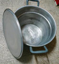 Pentolone in alluminio per la preparazione di salse di pomodoro, diametro 60 cm, altezza 40 cm, manici 18x9 cm, in ottime condizioni.