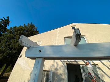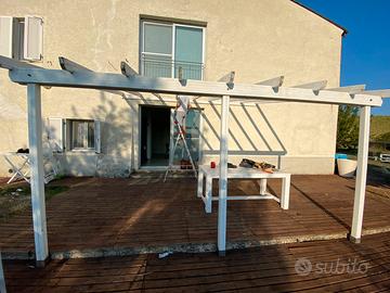 Pergolato in legno verniciato bianco, va addossato al muro , composto da tre pali verticali e una serie di pali superiori su cui appoggiare una copertura di canne o far arrampicare delle piante. Per le misure contattarmi.