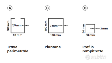 • Altezza sotto trave standard (lato basso): 230 cm, sezione piantoni 10x10cm.