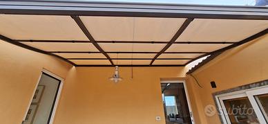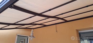 Bellissima addossata pergola griffata “L’OFFICINA” in acciaio zincato ‘a nastro’ e verniciato alle polveri color ‘corten’ e dotata del suo telo per la copertura in tessuto poliestere spalmato PVC 660 gr/mq (fattore Gtot di 0,10 CERTIFICATO) di colore avorio, acquistata nel 2018 e fatta fare su misura (larghezza 4,00 mt. x profondità 2,85 mt., altezza max 2,80/min. 2,15. La pergola è in ottimo stato ed è dotata di gronda anteriore integrata, con canalizzazioni di recupero e scarico dell’acqua integrate anch’esse nelle due gambe anteriori. Tutta la robusta viteria - in un ottimo acciaio inox - è presente e verrà consegnata assieme alla pergola. La pergola è dotata di decori di copertura per le piastre di fissaggio/appoggio alle basi delle gambe e di un binario integrato per montaggio della tenda coi relativi occhielli scorrevoli (entrambi optional!). Si fornisce già smontata e con le istruzioni per il montaggio nonché lo schema tecnico con le sue misure specifiche. Molto bella e raffinata col suo profilo ‘ad onda’, è pronta per essere installata su un terrazzo o nel giardino di un appartamento, oppure, visti i suoi colori naturali, nel giardino di una casa di campagna o di montagna, dove si integrerà perfettamente con l’ambiente circostante ! Oltre ai documenti di acquisto, sono disponibili altre foto e schemi su richiesta. Vendita prezzo affare € 800,00 Ritiro dal mio garage al piano strada con cancello carrabile (super-comodo!) a carico dell’acquirente.