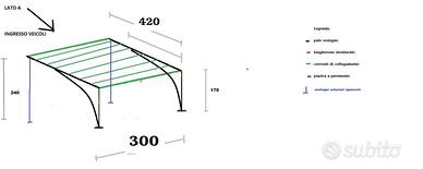 Pergola anti grandine per auto. Struttura in acciaio e plexiglass. La pergola nasce per essere installata "a sbalzo"(2 pali), oppure per appoggiare su 4 pali. Ha l'ancoraggio principale su un lato, il lato con lunghezza di 3 metri. Dei pali "extra" sono stati previsti per l'inverno, da poter montare in caso di necessità (neve), oppure da poter lasciare fissi tutto l'anno. Come da immagine, l'ingresso dell'auto avviene sul lato frontale alto 240 (lato A), e il muso dell'auto arriverà quindi a fine corsa nel lato alto 170cm. La copertura è lunga 420 cm, ed ha una larghezza da palo a palo di 3 metri. Per il montaggio su due pali si rende necessario avere delle fondamenta adeguate. Il prodotto viene venduto con copertura in plexiglass trasparente antigrandine e vernice color antracite brillante (come le attuali recinzioni delle moderne villette) per pitturare la struttura una volta montata. Tutti i componenti necessari sono in dotazione. Nuova, mai montata. Vendo per problemi di fondamenta in cortile e spazio. Prezzo trattabile.
