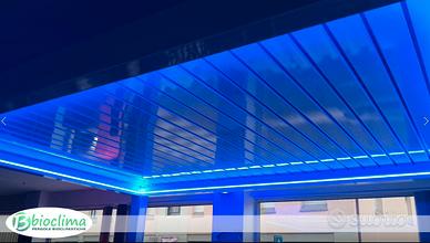 La bioclimatica BioS è la nuova pergola di gamma superiore con motorizzazione e controllo remoto di serie e impianto LED integrato.