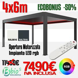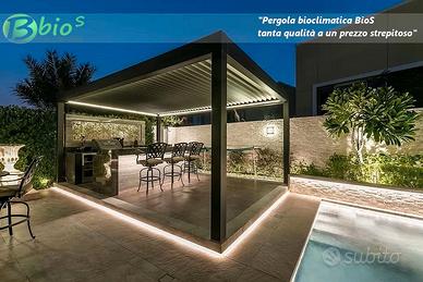 La bioclimatica BioS è la nuova pergola di gamma superiore con motorizzazione e controllo remoto di serie e impianto LED integrato.