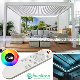 La bioclimatica BioS è la nuova pergola di gamma superiore con motorizzazione e controllo remoto di serie e impianto LED integrato.