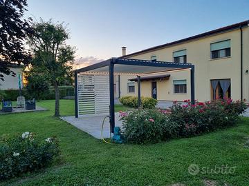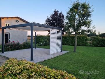 Bellissima pergola bioclimatica addossata costituita da una struttura in alluminio con lame parallele e apertura grazie a un sistema motorizzato silenzioso incluso nel prezzo
