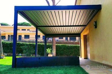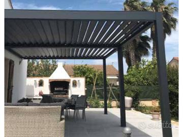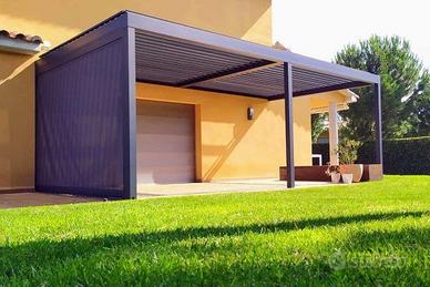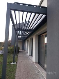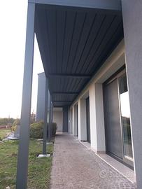 Bellissima pergola bioclimatica addossata (2 moduli - Horizon II) costituita da una struttura in alluminio con lame parallele facilmente regolabili grazie a un sistema motorizzato silenzioso incluso nel prezzo