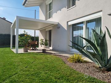 Funzionale pergola bioclimatica addossata dal design pulito con struttura in alluminio e lamelle orientabili motorizzate.