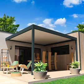 Grazie alle sue lamelle di alluminio regolabili a doppia parete, la nostra pergola bioclimatica è un perfetto compromesso tra una tenda da sole e una veranda e vi proteggerà dal sole in estate e lascerà entrare la luce in inverno.