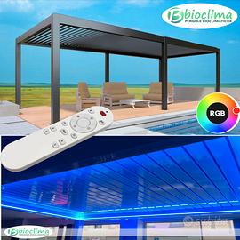 La bioclimatica BioS è la nuova pergola di gamma superiore con motorizzazione e controllo remoto di serie e impianto LED integrato.