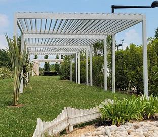 Pergola frangisole autoportante con telaio totalmente in alluminio a lamelle orientabili con meccanismo manuale.