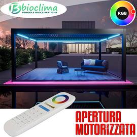La bioclimatica BioS è la nuova pergola di gamma superiore con motorizzazione e controllo remoto di serie e impianto LED integrato.