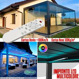 La bioclimatica BioS è la nuova pergola di gamma superiore con motorizzazione e controllo remoto di serie e impianto LED integrato.