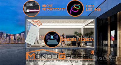 Pergola Bioclimatica in ALLUMINIO Grande qualità nuova imballata in kit di montaggio Ottimo gazebo fisso a lamelle, pompeiana importante, resistente, impermeabile Copertura che combina funzionalità ed estetica: PROTEZIONE-VENTILAZIONE-LUMINOSITA' PERGOLA BIOCLIMATICA DISPONIBILE IN 3 VERSIONI DI APERTURA LAMELLE: - MANUALE - MOTORIZZATA - MOTORIZZATA RETRATTILE Materiale: ALLUMINIO Montanti struttura: 150x150mm Trave perimetrale pergola: altezza 200mm Passo Lama: 20cm Carico Neve: 120 kg/mq Drenaggio Pioggia: 200mm/h Minuteria pergola bioclimatica tutta in acciaio INOX Doppia gronda con scarico dell'acqua alla base dei montanti della pergola (sempre 4 scarichi) Ricambi: sempre disponibili MANUALE Mod. ORION autoportante o addossata (stesso prezzo) colore BIANCO : Hsottotrave pompeiana 230cm 3,6x3,6 M - E 2.600 3x5 M - E 2.950 (6 piantoni) 3,6x5 M - E 3.500 (6 piantoni) 3,6x6,1 M - E 3.950 (6 piantoni) MOTORIZZATA Mod. PEGASO di serie compreso LED RGB-TELECOMANDO- SENSORE PIOGGIA-COPRIPIASTRE autoportante o addossata (stesso prezzo) disponibile colore: BIANCO ANTRACITE VERDE SALVIA MARRONE CORTEN: Hsottotrave pompeiana 250cm (a richiesta 280cm) 3x3 M - E 3.990 3x4 M - E 4.350 3x5 M - E 5.890 3x6 M - E 6.390 4x4 M - E 5.200 4x5 M - E 7.100 4x6 M - E 7.390 4x8 M - E 8.800 (6 piantoni) MOTORIZZATA RETRATTILE Mod. SYMPHONIA di serie compreso LED RGB-TELECOMANDO- SENSORE PIOGGIA-COPRIPIASTRE autoportante disponibile colore BIANCO - ANTRACITE: Hsottotrave pompeiana 250cm 3x3 E 6.600 3x5 E 9.500 3x6 E 10.600 4x5 E 10.800 4x6 E 12.200 4x8 E 17.900 (6 piantoni - doppio tetto) CHI SIAMO: Mondo Gazebo. lT PRIMI IN ITALIA PER LA VENDITA DI PERGOLE DI QUALITA' SHOW ROOM: visionabili sempre con appuntamento. Prezzi IVA22% COMPRESA, per ritiro in magazzino. Consegna pergola in tutta Italia a preventivo. Montaggio pompeiana semplice e veloce non richiede particolari competenze tecniche. Bioclimatica pergola 3 4 5 6 7 8 M gazebo tettoia box pensilina pompeiana