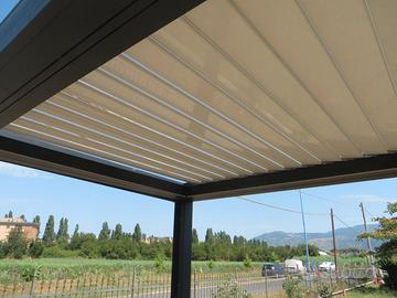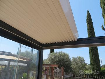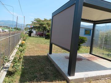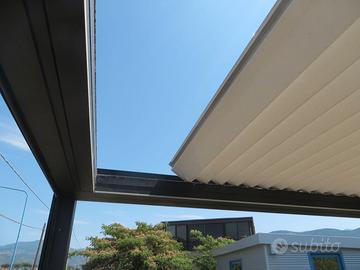 vendo pergola per esterno colore grigio scuro con lame superiori di copertura colore bianco, vetrata a tre ante scorrevoli da un lato e tenda motorizzata dall'altra e con altri due lati liberi di poter installare qualsiasi cosa. La struttura è in vendita per cambio prodotto. La struttura è stata utilizzata pochissimo quasi niente in quanto è un particolare installato come showroom. Luce led interna come illuminazione, tutto perfettamente funzionante. Smontaggio della struttura a carico dell'acquirente. Prezzo poco trattabile