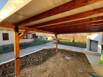 Pergola in legno abete lamellare adossata a muro con colertura telo in pvc grigio. Fatta in estate 2023 Misure mt 5x4,5x2