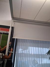 struttura bianca con cassonetto, motore e telecomando, tessuto impermeabile, tenda frontale sali scendi .