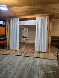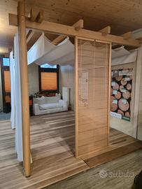 Realizzata con struttura robusta in legno massello e linee pulite, la pergola L350 offre una soluzione versatile per zone relax, aree lounge o spazi di accoglienza. Le tende laterali scorrevoli permettono di modulare privacy e luminosità, creando un ambiente intimo e protetto.