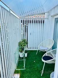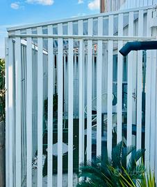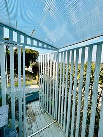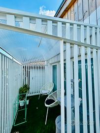 Pergola/ serra/ tettoia /gazebo da esterno in alluminio e policarbonato colore bianco montata 5 mesi fa quindi nuovissima. Metri 3 x 1,80 Altezza minima 2 metri Altezza massima 2,70 Formata da stecche in alluminio verniciate color bianco con spazio di 5 cm tra una e l’altra + tetto in policarbonato satinato Ideale per terrazzo o spazio esterno dove riporre piante o altro. Idoneo anche per ricavare uno spazio esterno per animali domestici in modo che stiano all’esterno ma al sicuro. Smontaggio a carico dell’acquirente ma si tratta di poche viti. Vendiamo per destinare lo spazio ad altro uso.