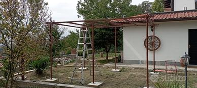Vendita di pergolati di fattura artigianale, realizzati con struttura di copertura in Ferro tubolare quadro e tamponamento in ferro tondo pieno per consentire ai rampicanti di crescere, gambe tonde munite di piastra a tassellare. Verniciatura color ferromicaceo rame.